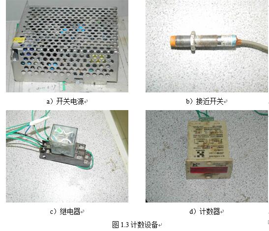 計數(shù)設備由開關電源、繼電器、計數(shù)器和接近開關組成,各部分見圖1.3。在偏心輪上粘貼一塊鐵片或者鋁片(見圖1.2(c)),當鐵片或者鋁片經過接近開關時,繼電器被觸發(fā),計數(shù)器數(shù)字增大一個,如此來記錄偏心輪轉動的圈數(shù),即加載次數(shù)。